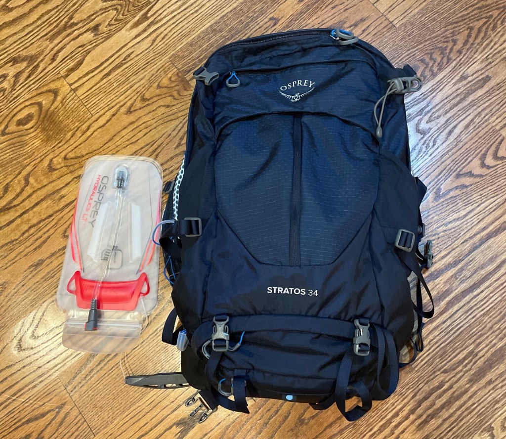 Next, I needed a backpack. Not just any pack. This was going to hold all my worldly possessions for 15 days. And it had to be light enough to carry everyday. I went to REI and got fitted for the Osprey Stratos 34 (34 Liter with rain cover). I also bought a 1.5 Liter water bladder. I was thinking that I want to keep things light. Only time will tell if this isn’t enough water.