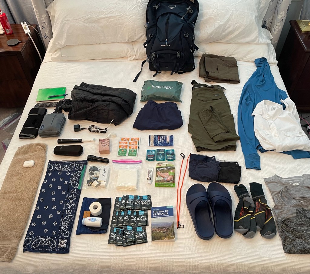 This is becoming very real now. About 6 weeks ago, I was visiting a good friend in Paris (Stephen Squire) and he told me that he was going to walk from Rome to Assisi along the Way of Saint Francis. I love Italy. I am retired. And I can walk, so I asked if I could join him. With his agreement and his itinerary in hand, I set off to prepare for this adventure. First, I needed shoes… rather, hiking shoes. Waterproof and high top for better ankle support. I found these Oboz at the local sportsman store. (I’ve never walked in there before.)
