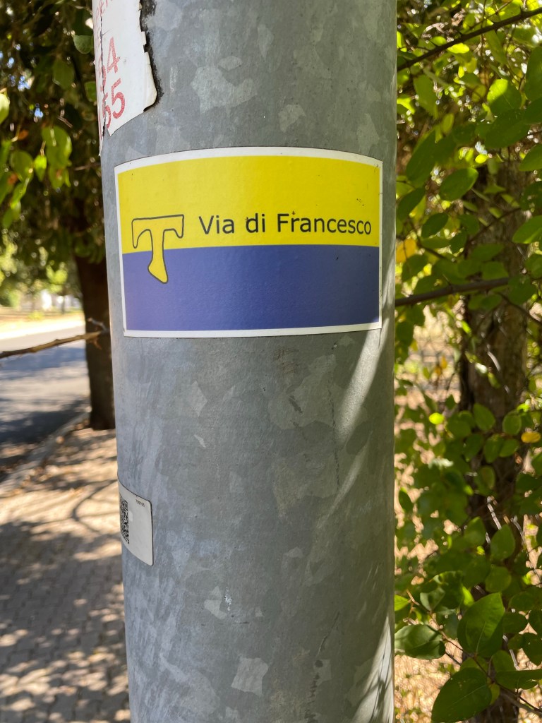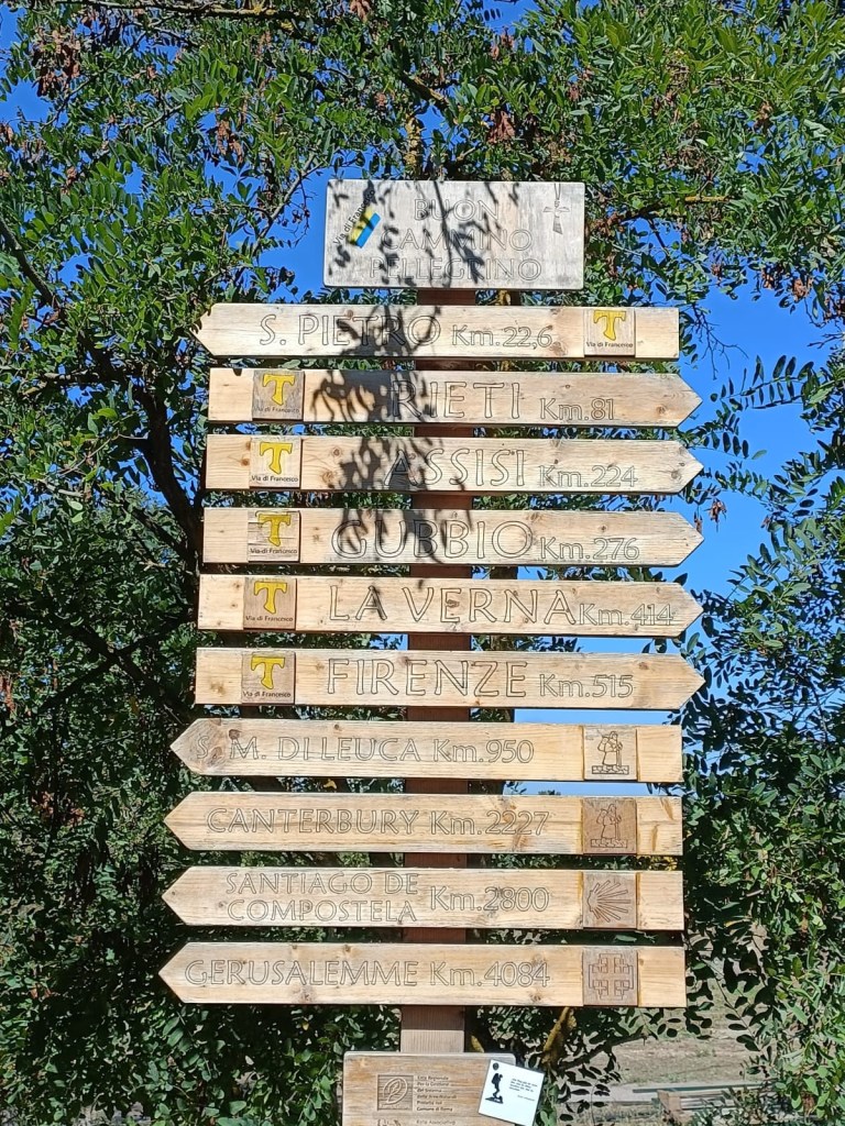 Via di Franceso is the route of St. Francis from Rome to Assisi. Basically, we are retracing the steps of this great saint. As a result, we are “i tre pellegrini” ( the 3 pilgrams). As you can see from the sign below, there are many destinations along this route.