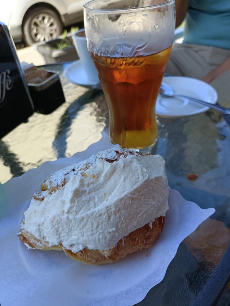 Unfortunately, Monday mornings are a tough day to hail a cab in Rome, so we had to wait for over 30 minutes. As a result, we were behind schedule when we left the departure point in Montesacro. The first 4 miles of this leg are on city streets, so we stopped to get some prosciutto, cheese, and bread for lunch. The last stop on the main road was a little food shop where I found the most delicious cornetto filled with whipped cream. Add a glass of peach iced tea and I’m in heaven.