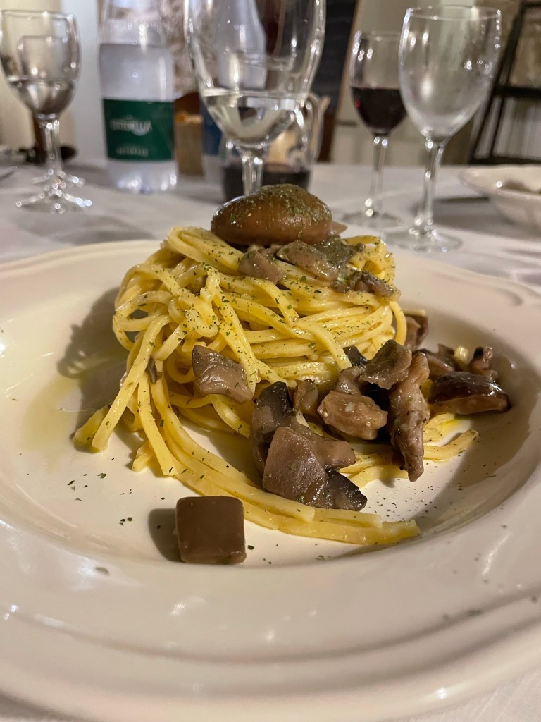 We ended our journey at the b&b where we were treated to a great meal of pasta ai funghi (mushrooms), chicken cacciatore, spinach, and lemon sorbet. A great meal for just 25 Euros.