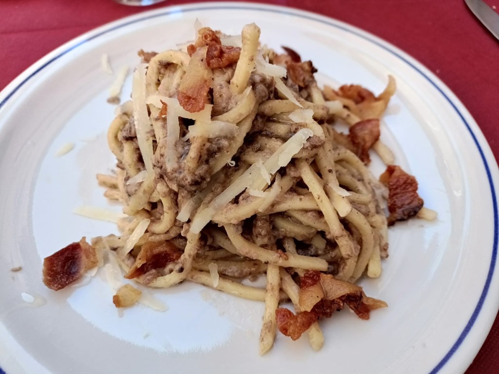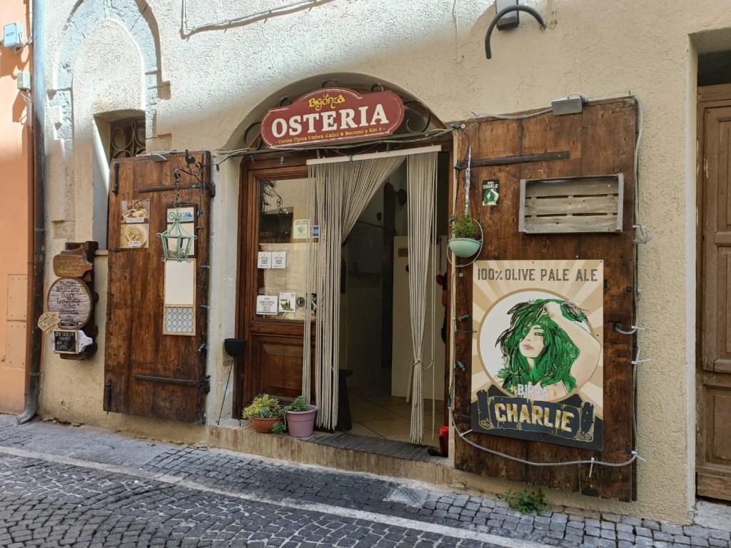 After only 3 hours, we made our way up the last hill to the midevil town of Trevi. Juan Pablo had selected a restaurant for us and since it was lunchtime, we went directly there. The restaurant was a small osteria with 8 tables, half of which we out on the street. The kitchen was in one storefront and the indoor seating was in another, a few doors away.