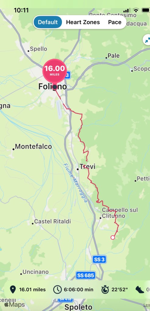 Today was Day 11 of our 12-Day walk across Italy. We hiked from Poreta to Trevi and then on to Foligno, for a total of 24 km or 16 miles. This was a double stage hike, which means we accomplished in one day, what the guidebooks suggest you do in two days. (Overachievers) As a result, I suggested that we would enjoy the hike better, if we walked without backpacks and used a taxi service to take them to our next destination. Stephen and Juan Pablo reluctantly agreed. And as a result, we had a fabulous walk.