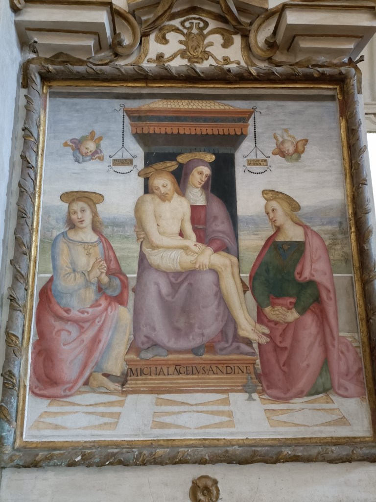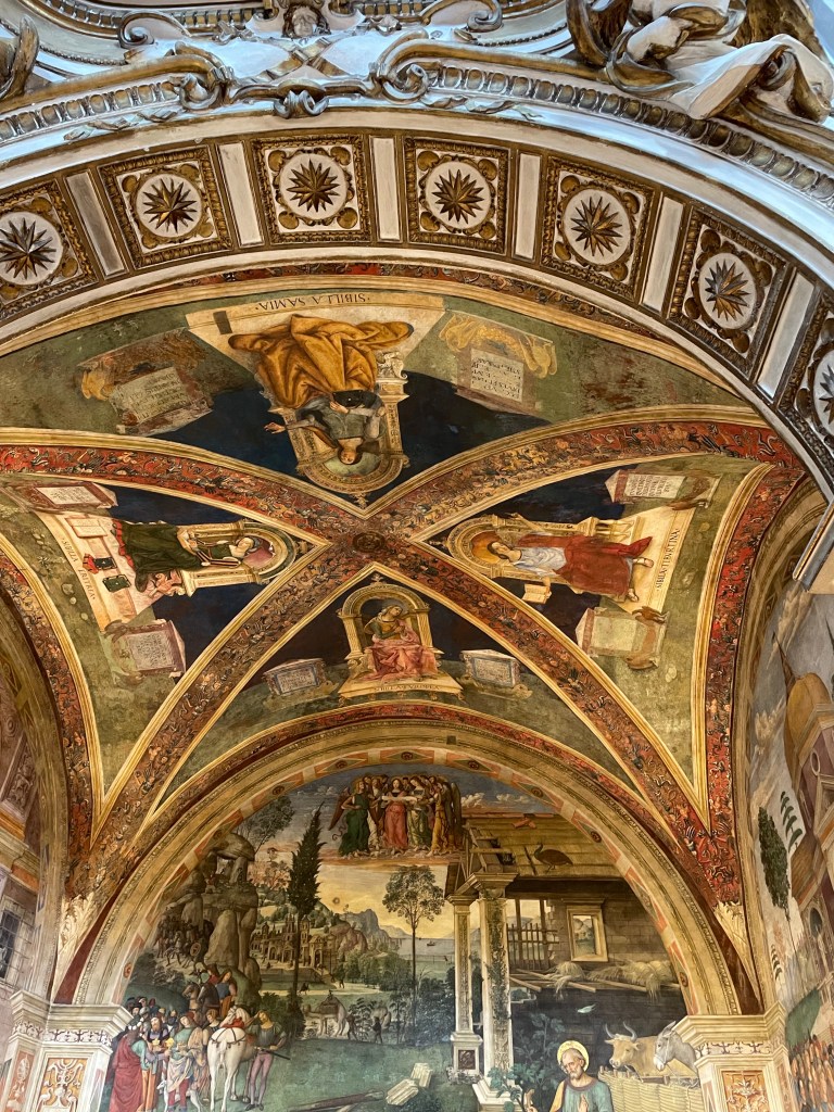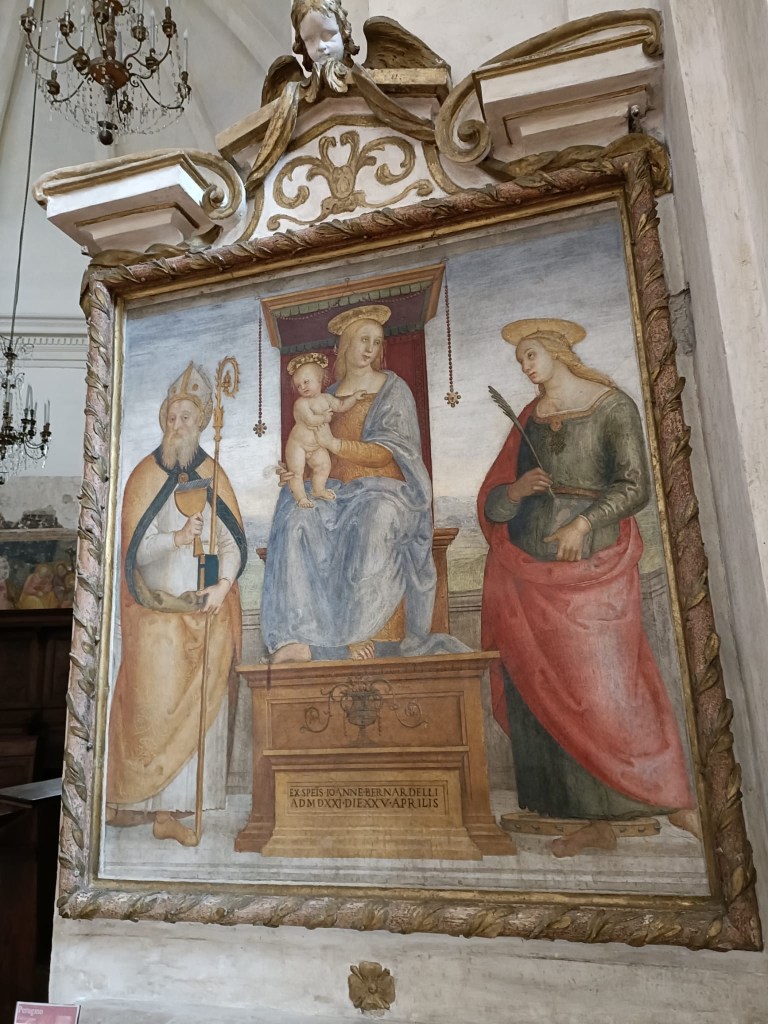 Since there was no place to stop for lunch on this last leg of our journey, we bought some paninis from a local shop in Spello. We even took the time to visit a little church which had some famous paintings by Pietro Perugino. (My friend, Becky Bilbo, would be proud of me.) Unfortunately, the church was filled with German tourist, who blocked the view of many of the frescos.