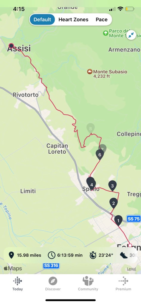 The day began with an early morning breakfast at a cafe in Foligno. From there, we quickly walked the 6km (4 miles) to the town of Spello in about 90 minutes. It was a beautiful, cool morning. And the walk to Spello was pretty flat. The day look like it was going to be relatively easy… at that point. There was only supposed to be one big climb at about the 14th km. On the map below you will see a little hook at Mile 6. Instead of going left, we went right and took an alternate route that added a couple of extra miles and about 1,200 feet of steep uphill climb! Ugh.