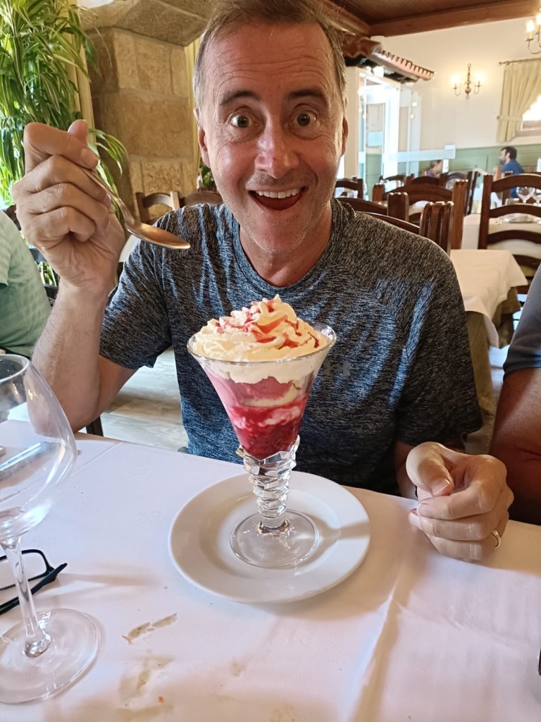 After dropping our bags at the hotel, which featured private rooms, air conditioning, a queen size bed, Jacuzzi tub, and a spa, we made our way to a restaurant for lunch. The fare was Portuguese veal steak topped with cheese, ham, egg, and homemade potato chips. But what really made this lunch special was the berry sundae with tons of “whoopin toppin” (whipped cream) for dessert. I immediately went back to the hotel and entered a 2-hour sucrose coma.