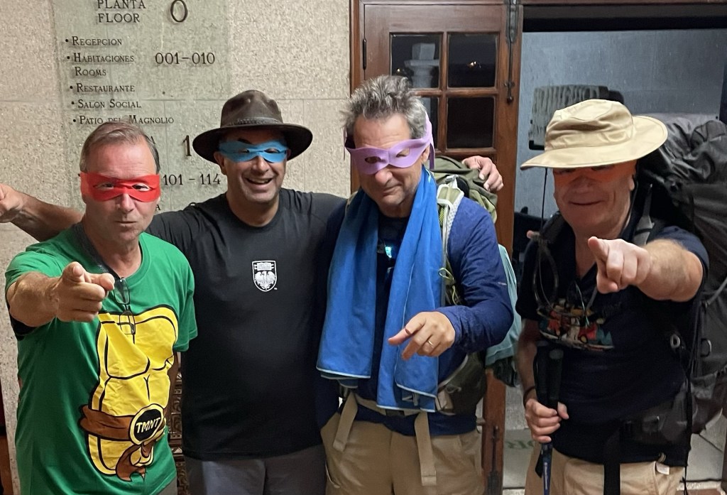 Today I decided to start our 13 mile journey from Tui to Porrino with a little surprise for my hiking buddies. Before leaving the USA, I purchased some Ninja Turtle costumes and surprised the guys this morning. (I’ve named our group the Old Age Mutant Ninja Turtles given our ages and obvious maturity.) Everyone was a good sport and donned their masks and posed for pictures in the hotel lobby. One hotel guest walked into the lobby and exclaimed that she wanted to “walk the caminho with those fun guys”!