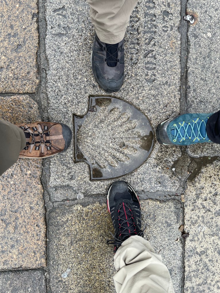 We departed the cathedral and made one more pass through the plaza. We found the shell marker which signifies the end point of all of the Caminos which run through Santiago de Compostela. We took one final picture to mark our accomplishment.