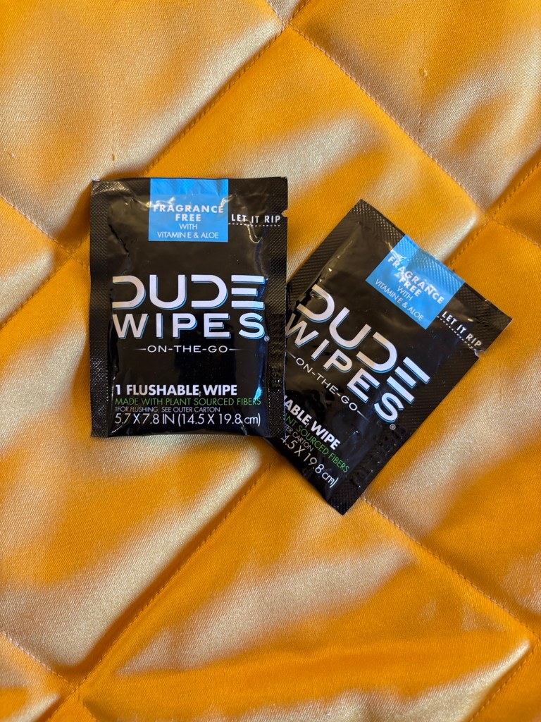 So of course you prioritized precious room to pack 21 individually wrapped Dude Wipes over an extra T or undies – because you can wash those in the sink. The Dudes get disposed….