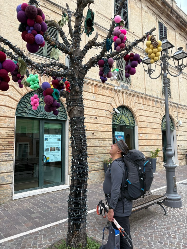 Camerano also had a unique art installation. Someone had covered a tree in the central piazza with giant, colorful grape clusters. JP stood underneath waiting fir some juice to fall. Silly man.