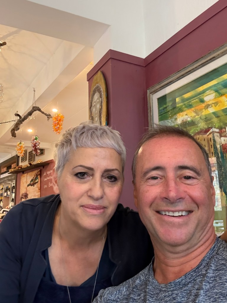 We did meet some interesting people today. First, there was a lovely group of Americans at the hotel who hailed from Worcester, Mass. (They would have called the rain “a wicked pisser”!) Next, we met a charming lady who owns a small restaurant in Cannara. She was very funny in that she sat down at our table to take our lunch order. (We thought she was going to eat with us too!) And lastly, we ran into our Swiss hiking friend, John Jacob, who happened into the same restaurant in Cannara.