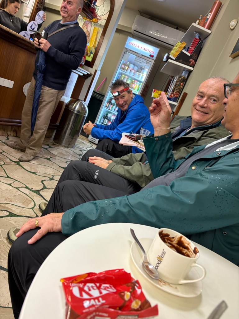 After about 2 hours of walking in the rain, we decided to stop for a warm drink at s little town. I ordered a hot chocolate, but what I got was warm chocolate pudding. The barista didn’t use enough milk! It was good and reminded me of the chocolate pudding that my Aunt Mary used to make for me when I was a kid.