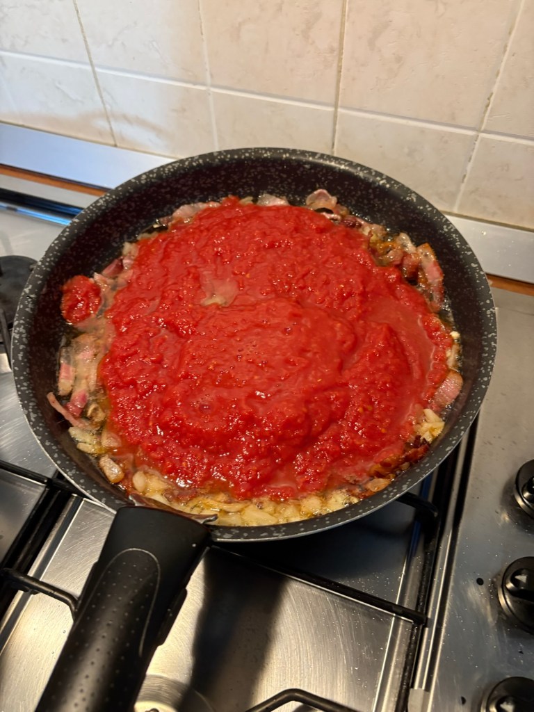 When we finally arrived at our b&b, we found out that their kitchen was closed on Tuesdays. The owner bought us some supplies and I made dinner. Pasta sauce with pancetta and onion. (Battlefield conditions!)