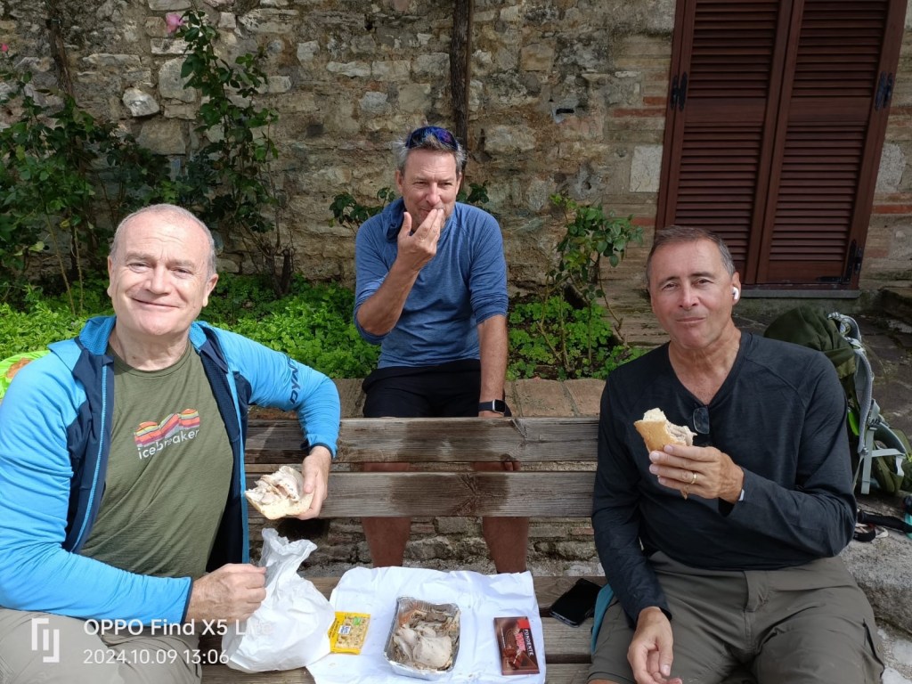 We had some wonderful meals today. First, Stephen made us coffee and tea in our nasty Bed & Breakfast, just to get out the door. At 11 o’clock, we walked into a little town where we had (what the Brits call) “Eleven-sies”. This is a light meal when the pangs of hunger strike. The “pasticeria” was filled with delicious pastries and espresso. We indulged.