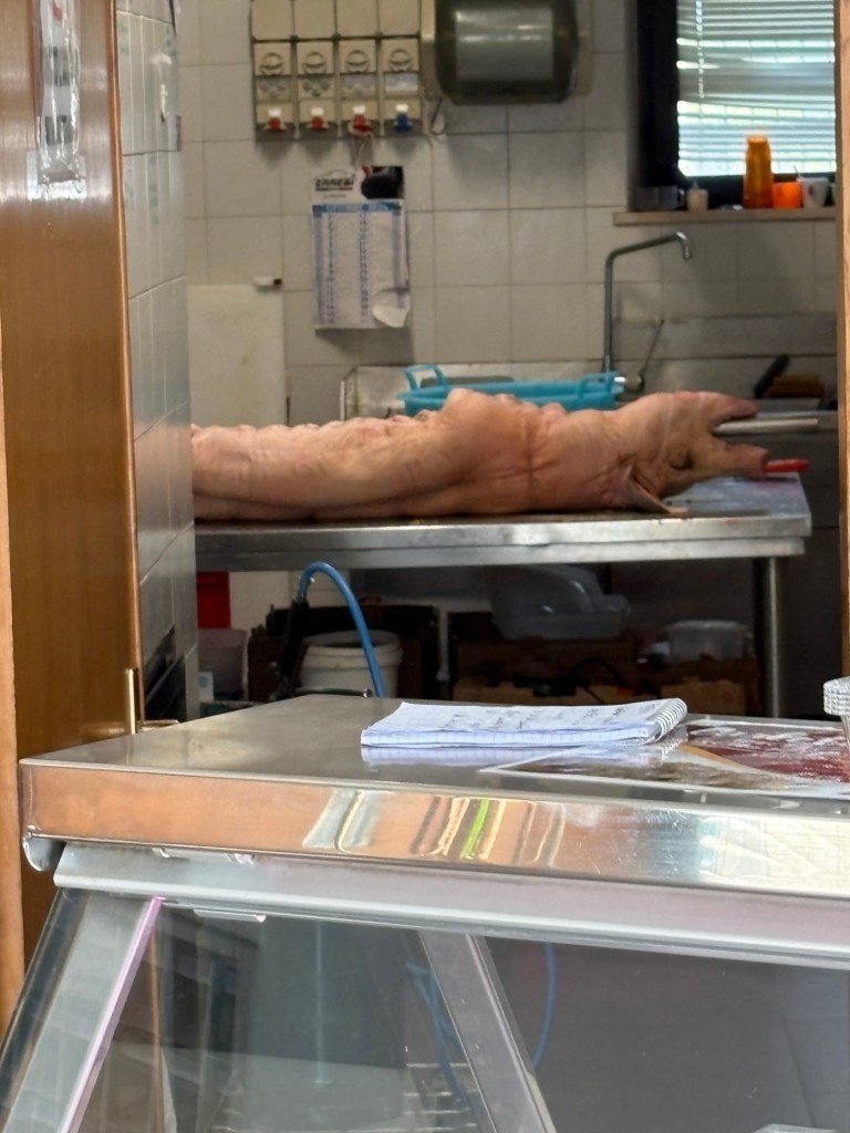 Before leaving town, we decided that we would need more fuel for this long day, so JP and I went to find the butcher shop, while Stephen and Joe went to the grocery store for fruit, nuts, and some tomatoes. The butcher shop was an eye-opening experience. The first thing I saw was a full pig on a spit, lying on a table in the back room. It was HUGE!