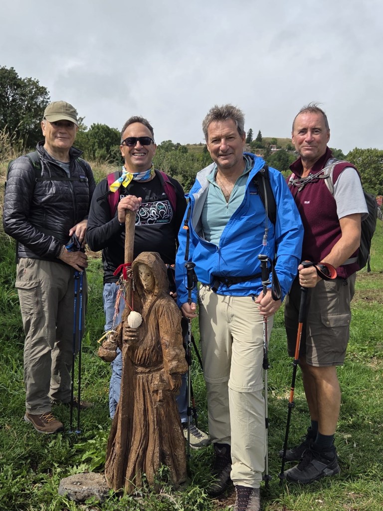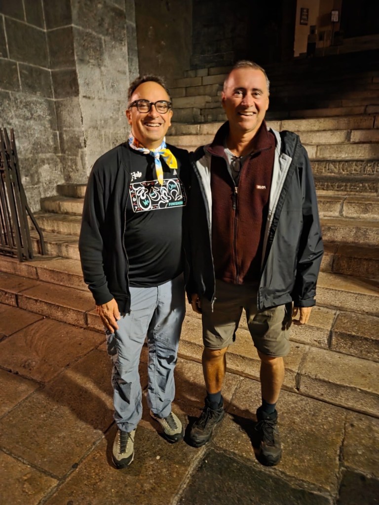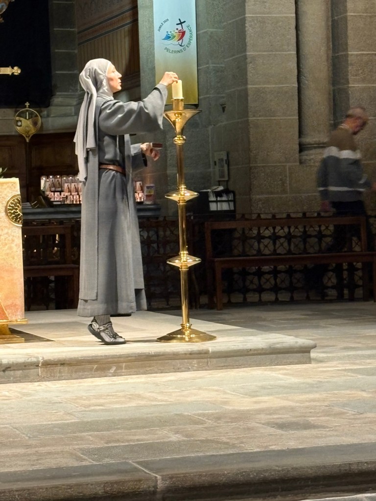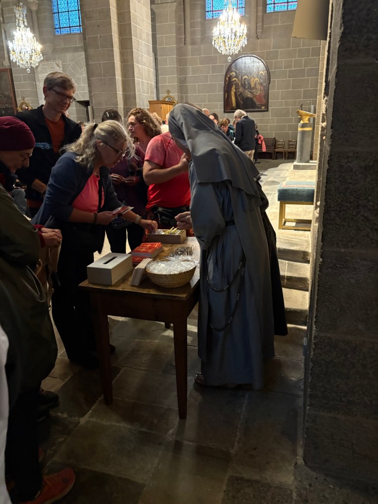 JP and I attended the Pilgrim Mass at 7am because: (1) it was Sunday and (2) we heard that there would be a special blessing ceremony for those walking the Camino that morning. (That’s us.) Stephen didn’t join us because he is too grumpy before his morning coffee and Joe bowed out because he claimed to be a “fallen Catholic” ( I figured he meant, as in “fallen” back to sleep). Anyway, there were some 300 pilgrims who attended this mass before embarking on their trek. Most from France, but some from Canada, Colombia, USA, and South Africa.